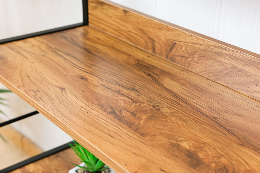 - Material madera aglomerada con partículas de madera y lámina de pvc que le da brillo, protección y color.