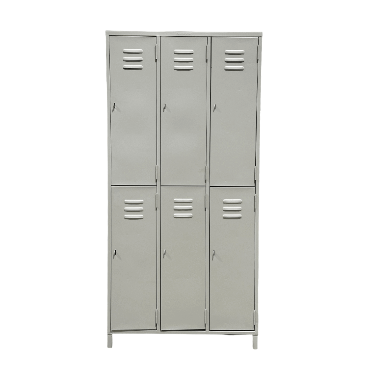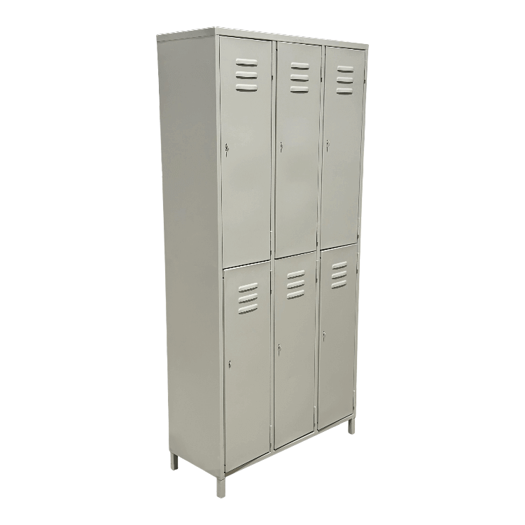 Locker de metal de 6 compartimientos de estructura fuerte y firme (no remachada), construidos en metal en hierro 0,75mm de espesor, son pintados con pintura en polvo, a base de resina, utilizando un sistema de aplicación electrostático y polimerizado a más de 160 grados utilizando planchas de infrarrojo en los hornos, con fosfatizado que protege al mueble de la corrosión.