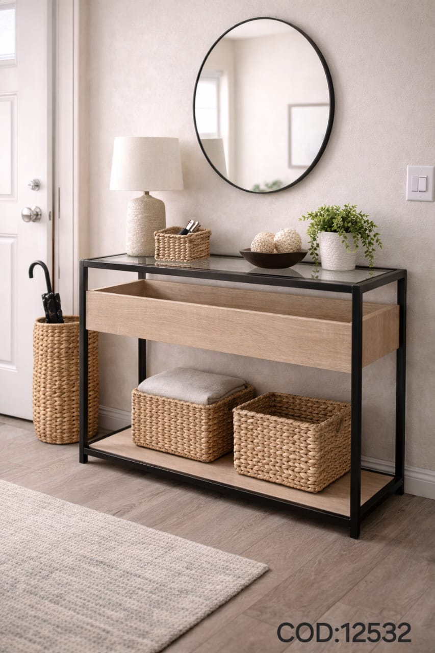 Moderna mesita recibidora con estructura metálica negra y acabado en madera natural. Diseño funcional con cajón amplio y repisa inferior, ideal para mantener tu entrada organizada con estilo. Perfecta para darle un toque elegante y acogedor a tu hogar.