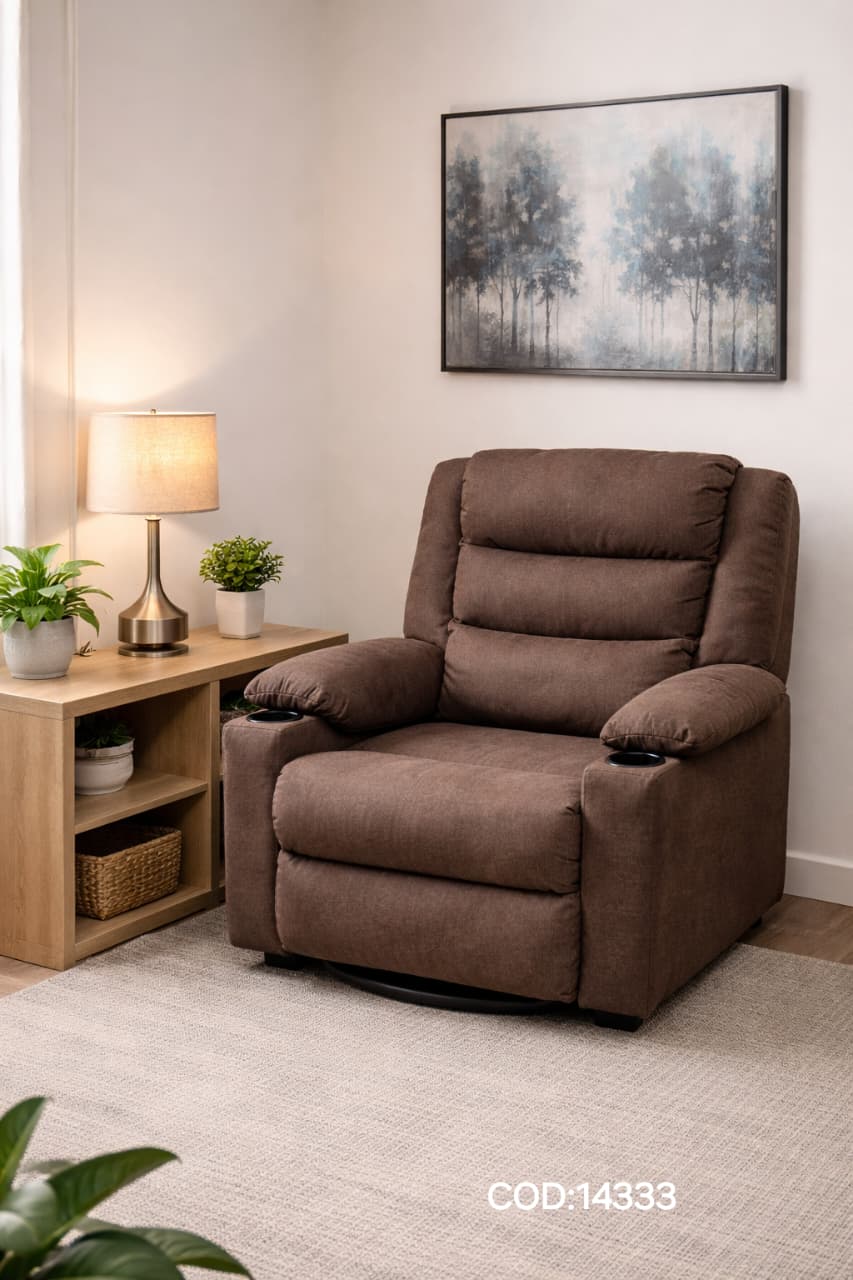Sillón reclinable cómodo y elegante, ideal para descansar y ver TV. Acolchado grueso, tapizado suave y con portavasos en los brazos para mayor practicidad. Perfecto para sala o cuarto de entretenimiento. 🛋️✨